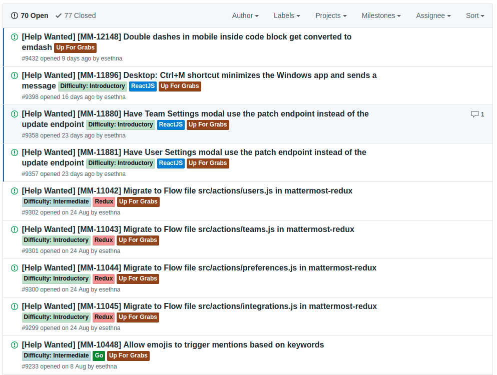 Up For Graps는 아직 Assign된 사람이 없는 이슈를 의미하고, Difficulty: Introductory는 수정이 단순하고 쉬운(것으로 예상되는) 이슈를 의미합니다. 이 두 라벨로 필터링하면 입문자도 힘들이지 않고 첫기여를 할 수 있습니다.