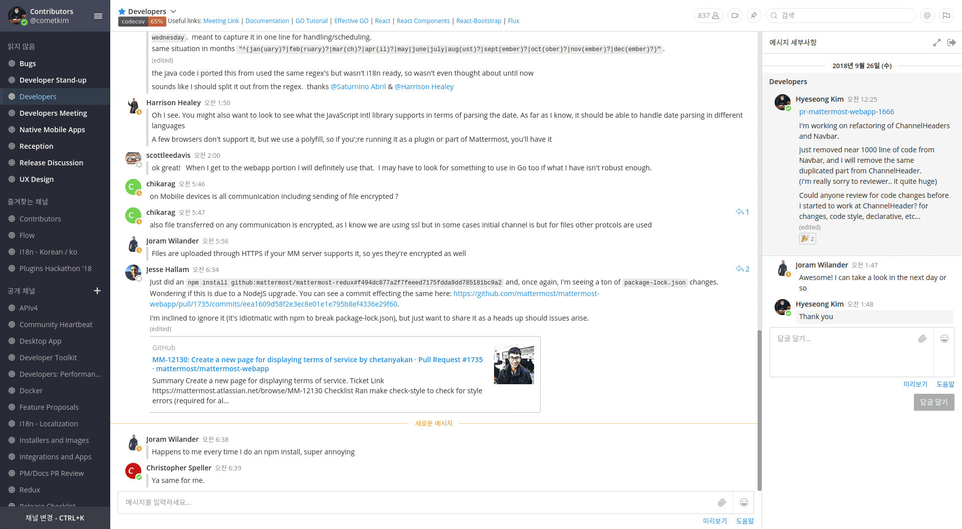 적어도 표면적인 부분에선, 커뮤니티 관리가 더 잘 되고 있습니다. Mattermost의 커뮤니티 관리는 정말 훌륭합니다.