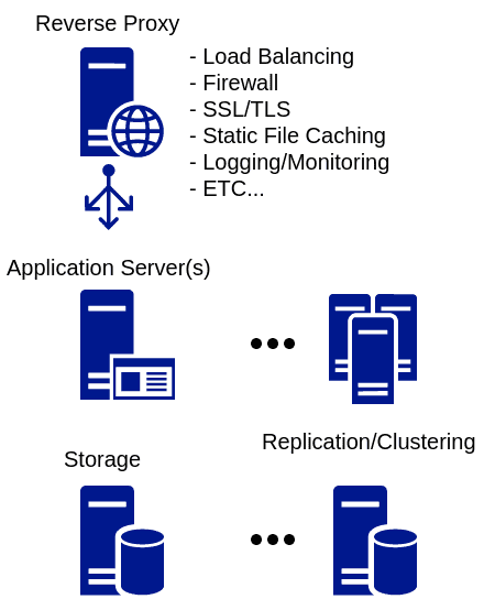 일반적으로(적어도 내가 봐온 것들 기준으로) 작은 규모의 웹 서비스는 위 그림같이 프록시, 앱(+런타임) 서버, 스토리지(File, DB, Cache 등)으로 구성된다.